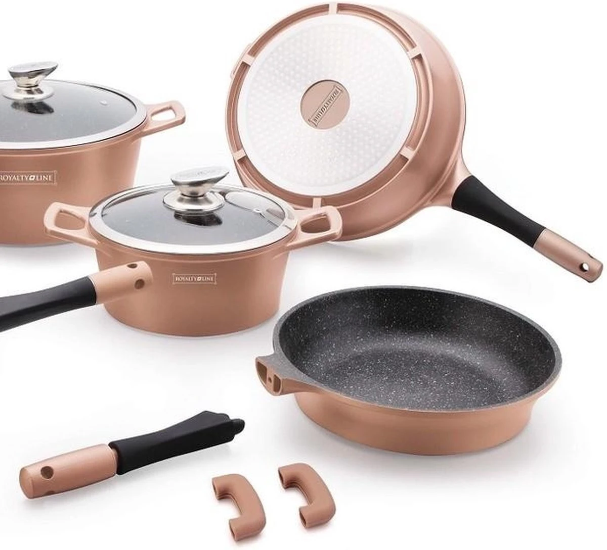 Een zeer uitgebreide set van Royalty Line Switzerland is een goede eerste stap naar goed en gezond koken. De pannen hebben een hoogwaardige marmercoating en zijn geschikt voor alle warmtebronnen, inclusief inductie en oven. Kortom een pannenset die je niet mag missen in huis!