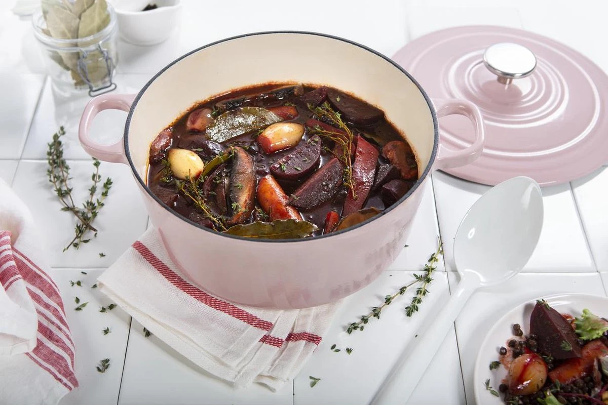 De traditionele BK Bourgogne Braadpan heeft een wit geëmailleerde gladde binnenkant. Door de druipringen in de deksel, wordt het kookvocht gelijkmatig verdeeld. Hiermee voorkom je dat je gerecht droog wordt. Hiermee is de BK Bourgogne functioneel en een echte eye-catcher in de keuken en op tafel.