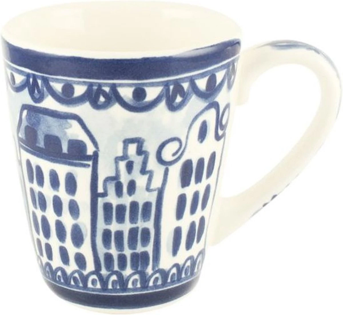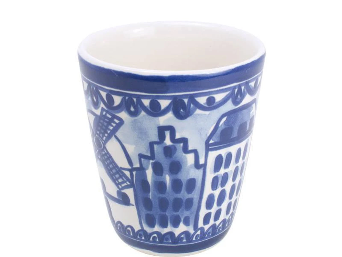Deze molenbeker is gemaakt met een knipoog naar het oud-hollandse Delfts blauw servies. Dit vrolijke servies is gemaakt door twee vriendinnen van het inmiddels bekende Blond Amsterdam. A bit of Blond every day! Materiaal: aardewerk Hoogte: 11 cm Diameter: 9 cm Handbeschilderd Vaatwasmachinebestendig Geschikt voor oven en magnetron