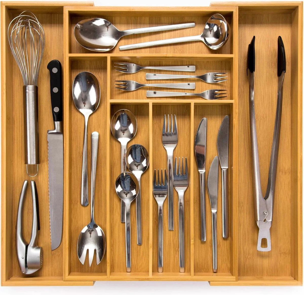 De Budu Bestekbak geeft uw besteklade een opgeruimde en luxe uitstraling. De bestekbak is gemaakt van 100% duurzaam bamboe. Bamboe is een zeer sterk en slijtvast materiaal. De bestekbak past in vrijwel elke lade, omdat hij in de breedte uitschuifbaar is. De bestekbak beschikt over maximaal 8 compartimenten, hierdoor kunt u al uw keukengerei netjes opbergen. De bestekbak is ook te gebruiken als organizer voor andere producten, zoals kantoorartikelen, gereedschap of make-up.