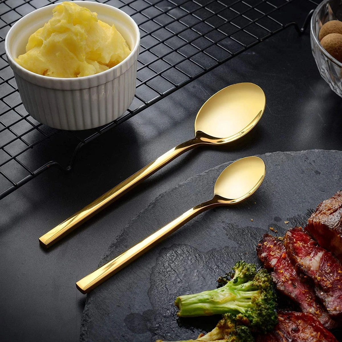 Laat je eettafel opvallen met een zilverwerk set die in het oog springt zonder visueel overweldigend te zijn. Goud ontwerp en nette patroonhandgrepen maken deze zilverwerk set gemakkelijk te integreren in elke omgeving.