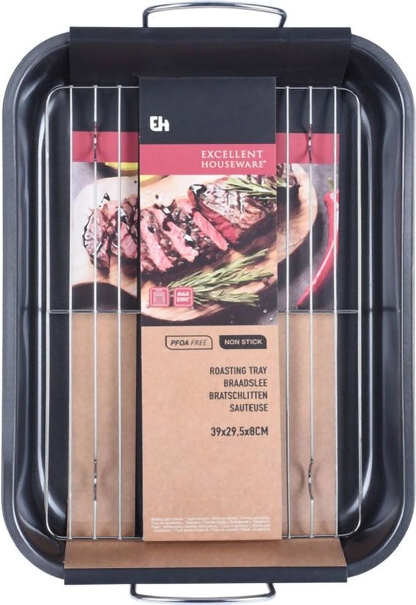 Stalen non-stick braadslee met rooster en handgrepen, ideaal voor het in de oven bakken van vis, vlees, gevogelte, wild, en andere gerechten.