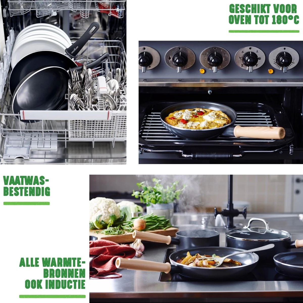 De PFAS-vrije GreenChef Vintage pan is geschikt voor alle warmtebronnen, inclusief inductie. De Vintage pannen zijn vaatwasserbestendig en gemakkelijk te reinigen. De wokpan is bestand tegen metalen spatels, maar gebruik bij voorkeur siliconen kookgerei voor een langere levensduur van de pan.