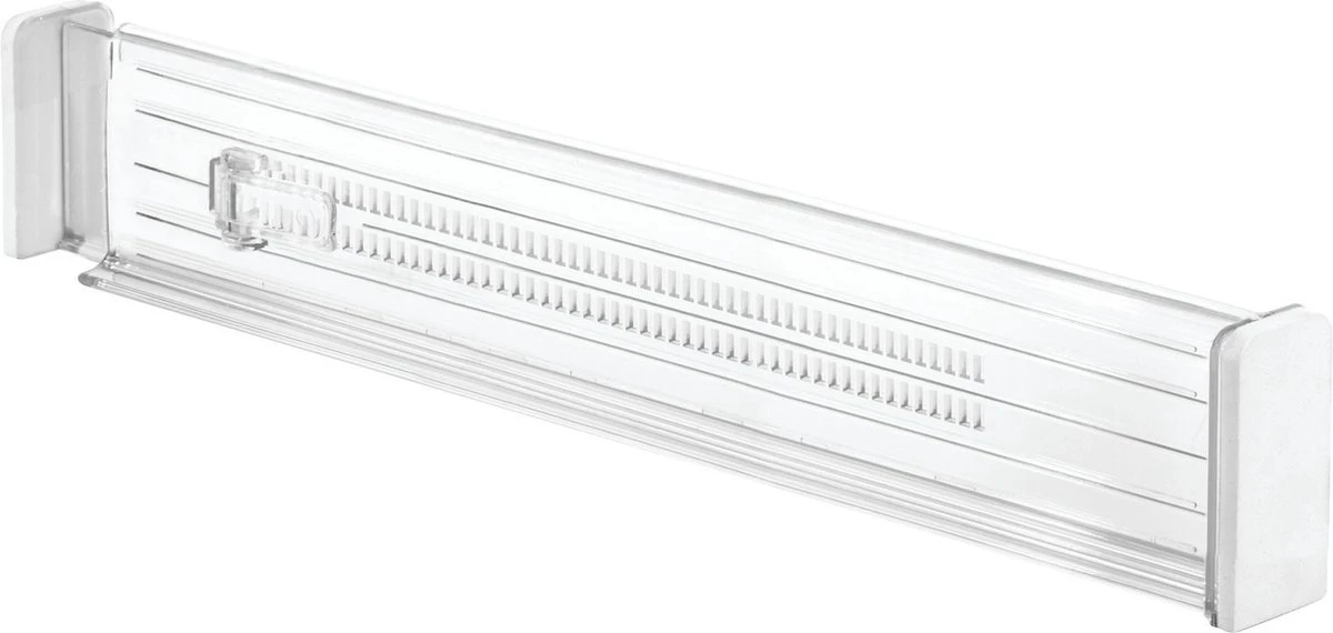 De ladeverdeler is uitschuifbaar van 34,5 tot 52,5 cm en is 6,5 cm hoog. Je kunt kiezen uit wit of transparant. Het is gemaakt van stevig acryl kunststof en makkelijk schoon te maken met een vochtige doek. Wanneer je de gewenste maat hebt ingesteld vergrendel je deze eenvoudig met een lock clipje die je omzet.