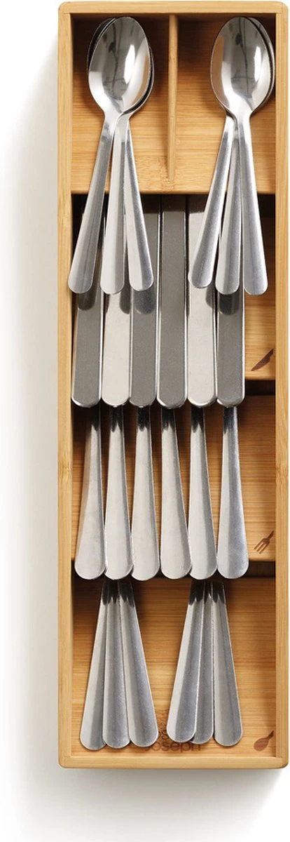 Het slimme design van de bestek organizer zorgt voor extra ruimte voor andere keuken accessoires. De vakken van de bestekbak van bamboe zijn zó ontworpen dat het bestek boven elkaar wordt geplaatst. Zo kun je veel meer erin kwijt, en behoud je het overzicht in je keukenlade. Ben je op zoek naar nog meer producten om je keukenlades mee in te delen? De Drawerstore collectie van Joseph Joseph bevat nog meer organizers die ruimte in jouw lades besparen!