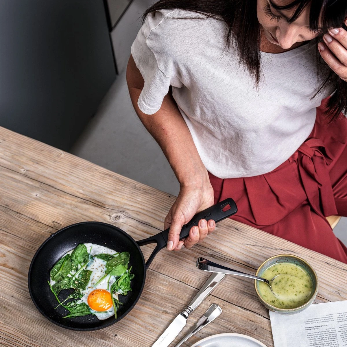 ❕ Metalen keukengerei kan bij een verkeerd gebruik de antiaanbaklaag van je pan beschadigen. Houten, rubberen of plastic keukengerei is veiliger en het zorgt ervoor dat je antiaanbaklaag er als nieuw blijft uitzien.