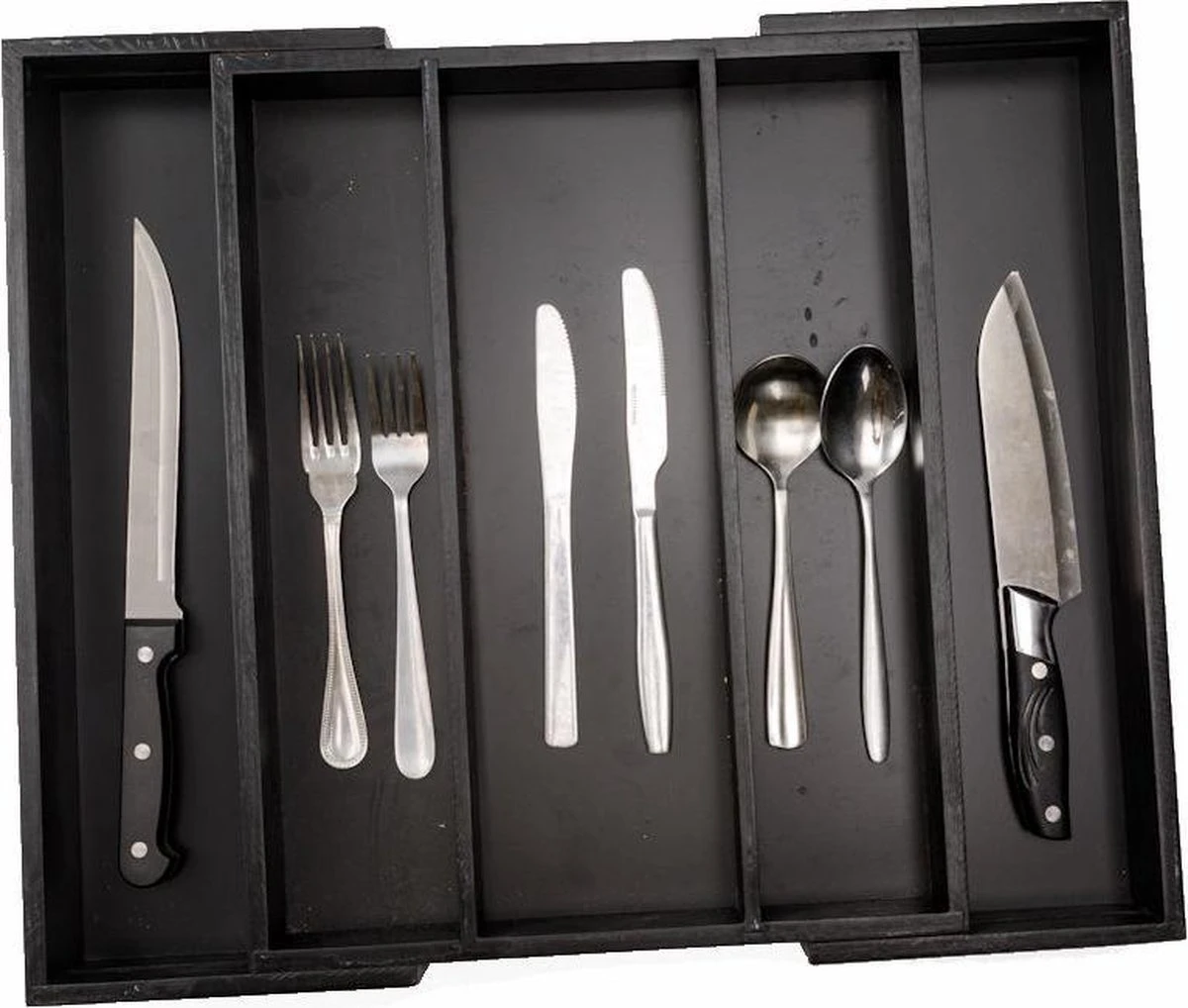 De bestekbak is eenvoudig uitschuifbaar. Zo pas je hem aan je wensen aan. Door de bestekbak uit te schuiven creëer je aan beide zijdes een vak extra. Als je de zijkanten uitschuift heb je bestekbak met 5 vakken. Genoeg ruimte voor al je bestek!