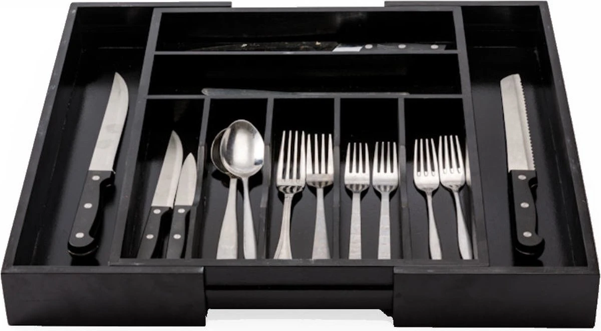 Super handige uitschuifbare bestekbak van bamboe met 7 tot 9 vakken. Ideaal om je keukenlade te organiseren! Kleur: Zwart