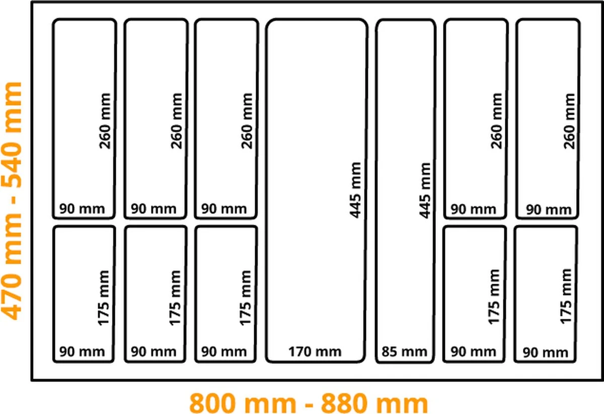 Onze bestekbakken van kunststof zijn in de breedte en diepte aanpasbaar naar het formaat van uw lade. Bestekbakken van kunststof zijn namelijk eenvoudig op maat te snijden met een hobbymes of stanleymes. U hoeft de bestekbak alleen maar een aantal keren in te snijden waarna u het overbodige kunststof kunt afbreken. In de breedte is de bestekbak aan te passen van 80 cm tot 88 cm. De diepte van de bestekbak is aan te passen van 47 cm tot 54 cm.