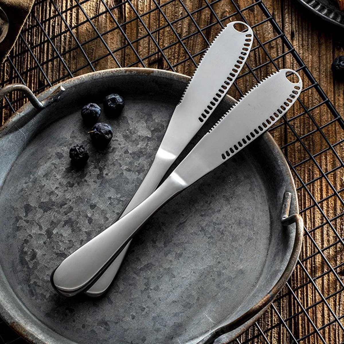 Bestek moet veilig te gebruiken zijn, dat geldt ook voor botermessen! Deze zilverkleurige set bevat naast een mooi stijlvol uiterlijk, ook nog eens praktisch nut! De gaatjes in de messen zorgen ervoor dat de boter op de juiste manier wordt gesneden en uitgesmeerd. Prettig voor het oog en ook nog eens multifunctioneel. Wat wil je nog meer?