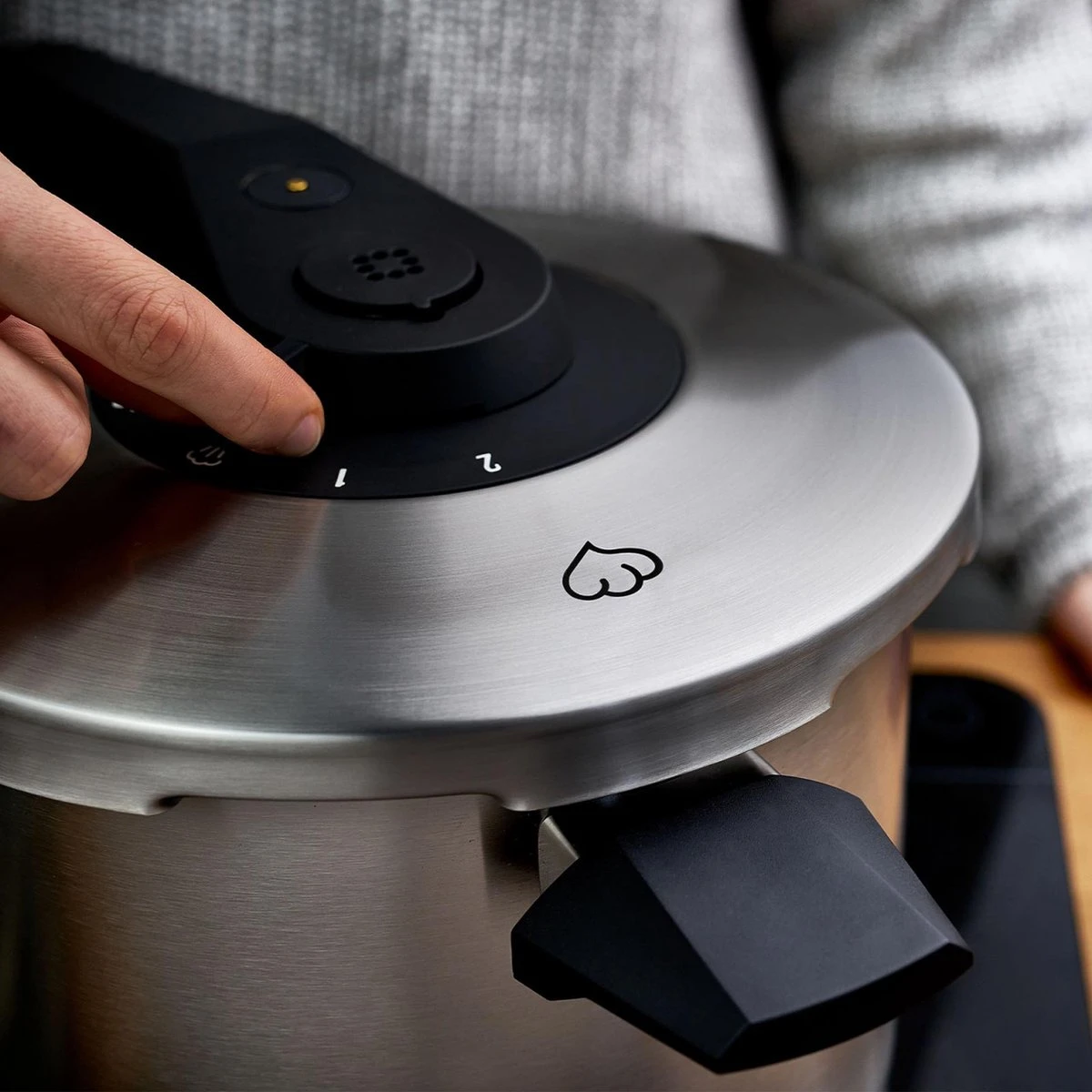 Je kan zonder aarzelen beginnen met koken, het deksel is duidelijk gemarkeerd zodat je het gemakkelijk kan sluiten. Tijdens het koken zorgen 5 verschillende veiligheidsmechanismen ervoor dat de ontstane druk altijd op een controleerbaar niveau wordt gehouden. Met de drukregelaar en de drukindicator kan je jouw kookkunsten op elk moment in het oog houden. Zodra het kookproces is voltooid, verdwijnt de stoom via de naar boven gerichte stoomuitlaat rechtstreeks in de afzuigkap.